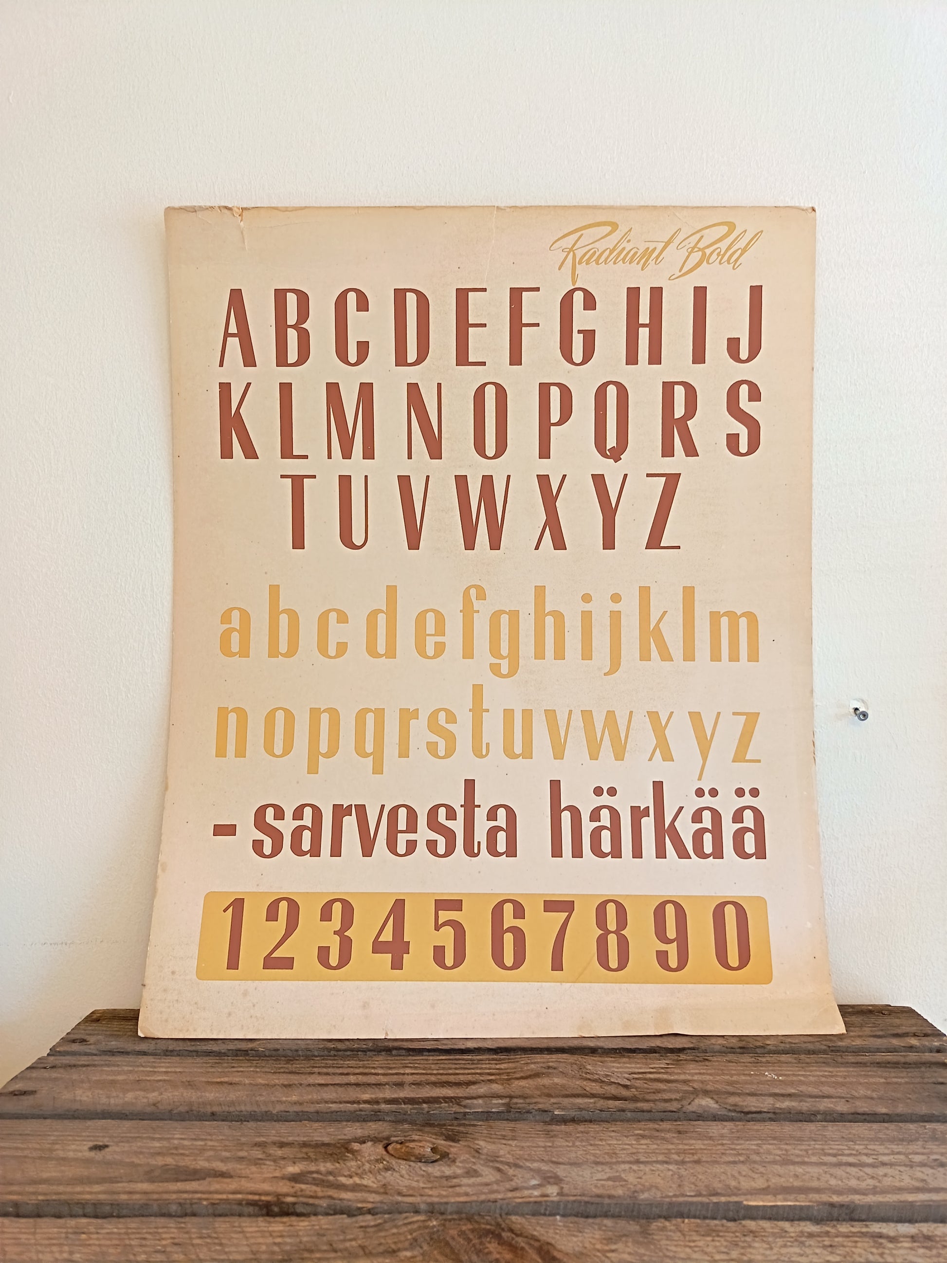 Pahvinen vanha taulu joka esittelee kirjaintyypin. Pieni repeämä sekä vähäistä kulumaa reunassa, muuten hyväkuntoinen. Koko 40x50cm.