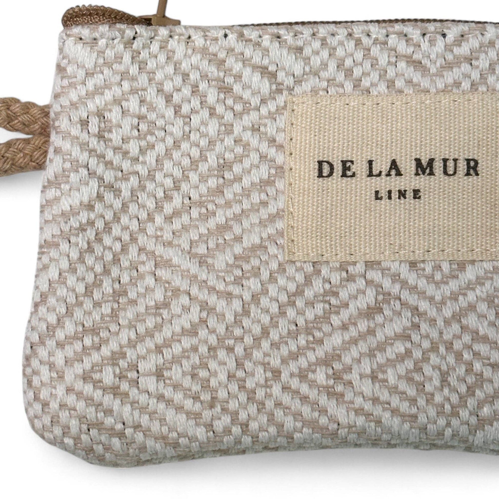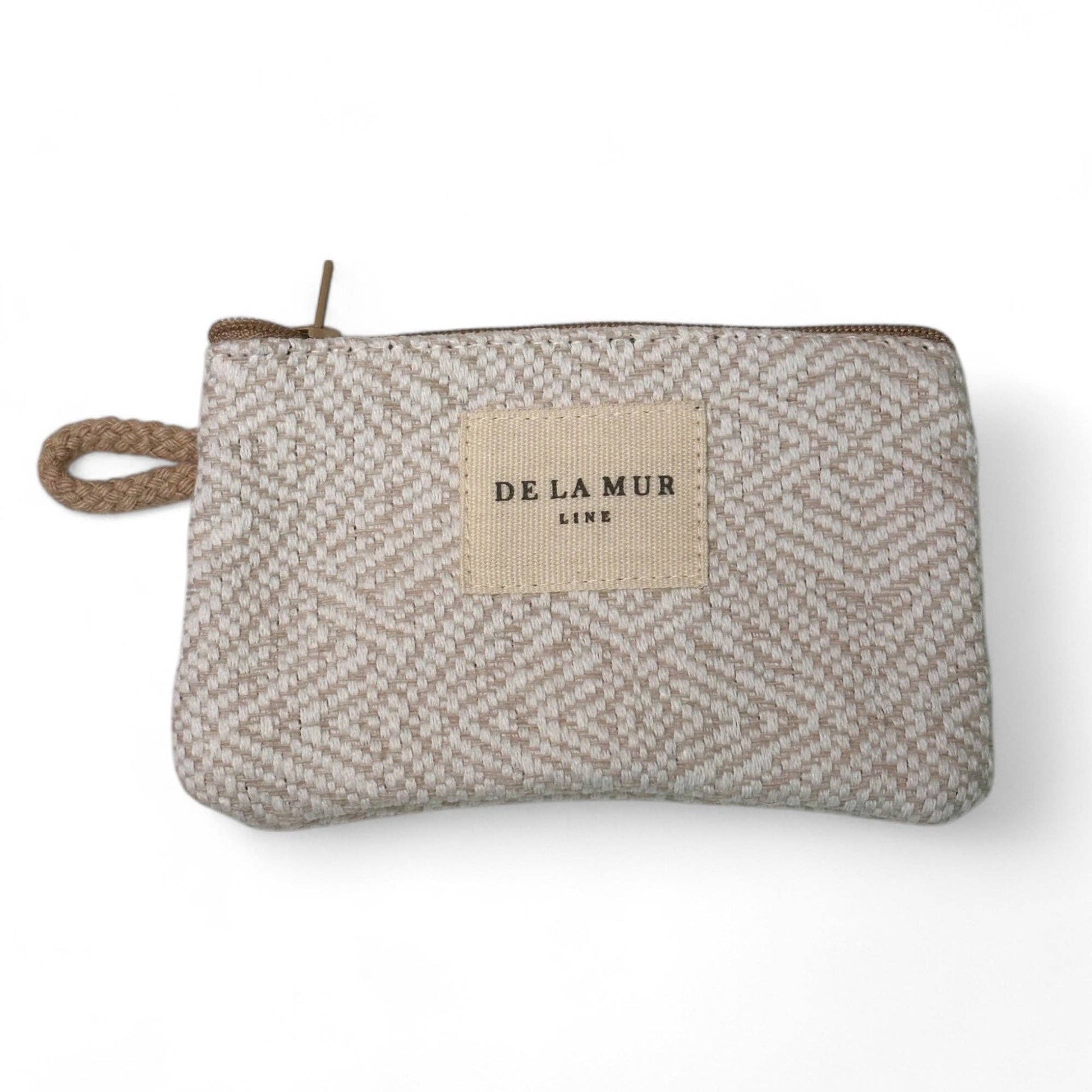 Kätevän kokoinen vetoketjullinen lompakko, jossa pieni kantolenkki sivussa. Valmistettu paksusta jacquard-kankaasta, jossa kermanvärinen geometrinen kuosi. Sisäpuolella harmaa vuori. Sopii seteleille, korteille ja kolikoille – mahtuu hyvin kaiken kokoisiin laukkuihin.