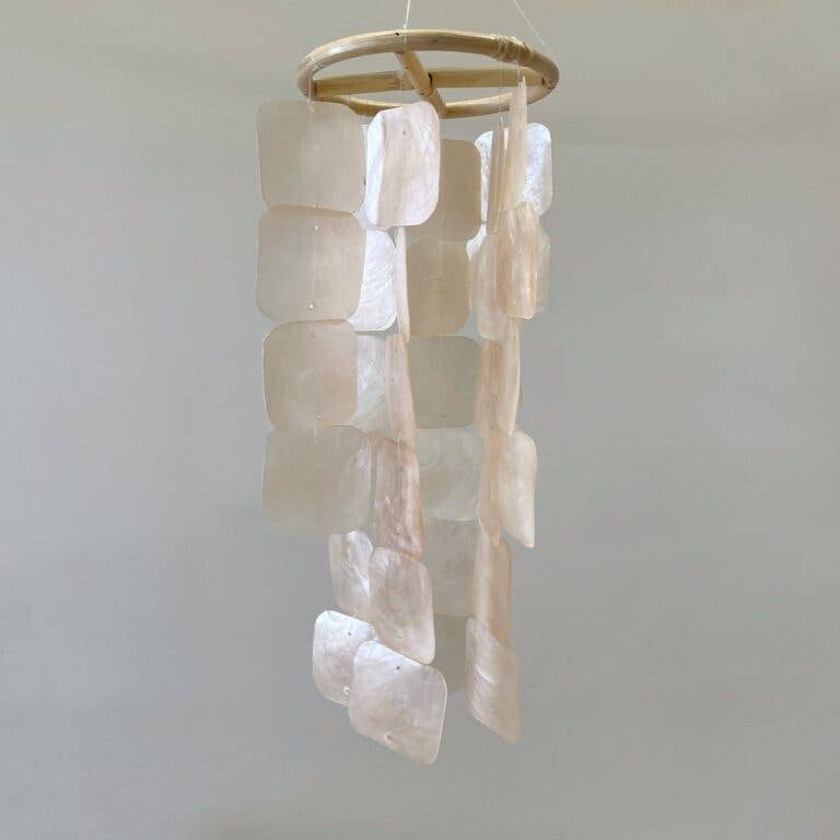 Tämä upea mobile on valmistettu roosan sävyisistä, pyöristetyistä simpukoista, jotka on kiinnitetty luonnolliseen rottinkikehykseen. Se sopii kauniisti katetulle terassille tai verannalle, mutta myös tunnelmanluojaksi lastenhuoneeseen. Ihanan heleä, kaunis ääni kun mobile liikkuu. Saatavilla kahdessa koossa: XS ja M. Mukana siima ja koukku ripustamista varten.