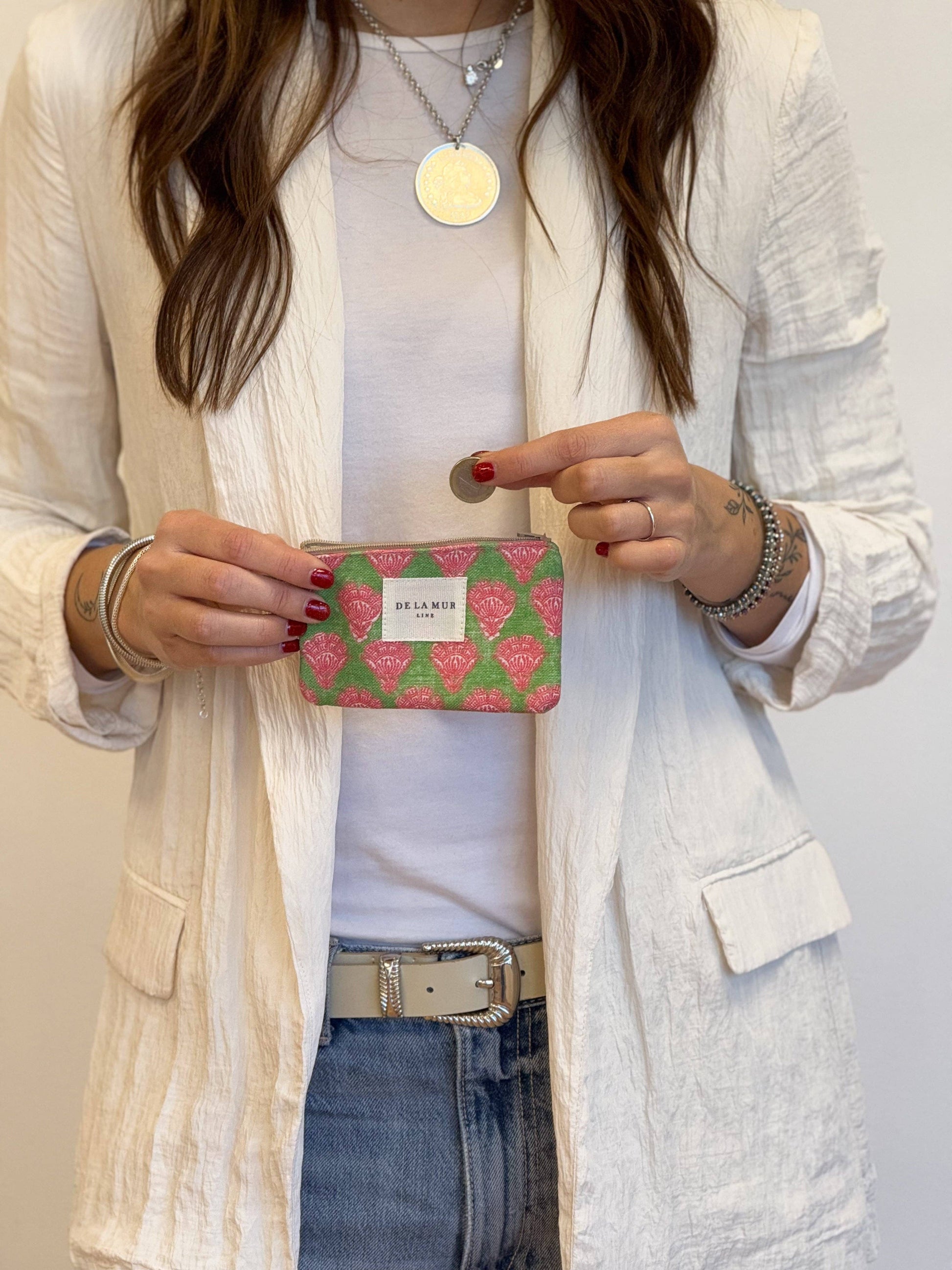 Zippered wallet with a small beige cord handle on the side. Made of fine half-panama fabric with a floral print in pink and green tones. Each item may have a variation in the print, depending on where the piece was cut. Lined with thick gray fabric on the inside. For proper maintenance, it is recommended to wash it by hand in cold water and not to use a dryer.