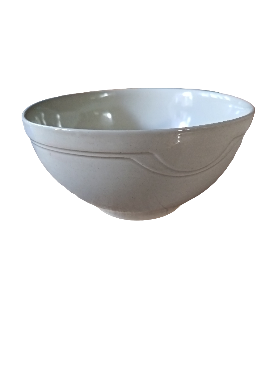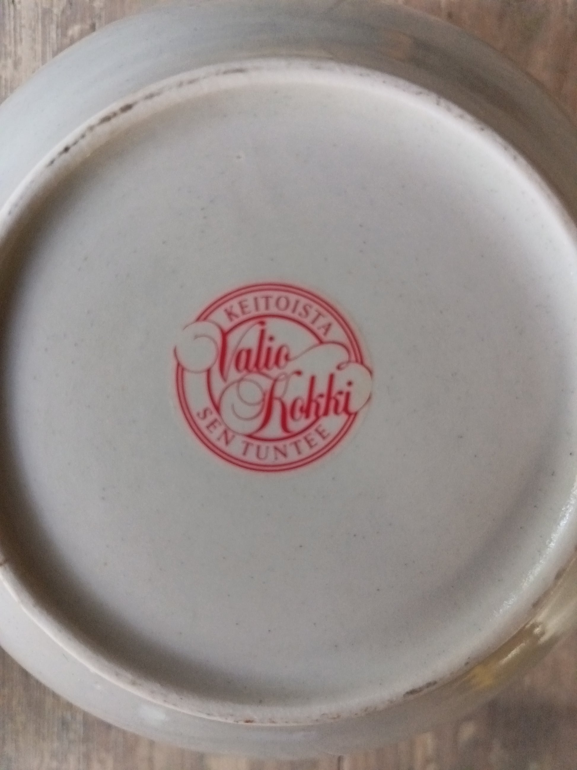 Virheetön beige kulho, keramiikkaa, pohjassa teksti "keitoista sen tuntee ValioKokki. Halk. n. 19cm.